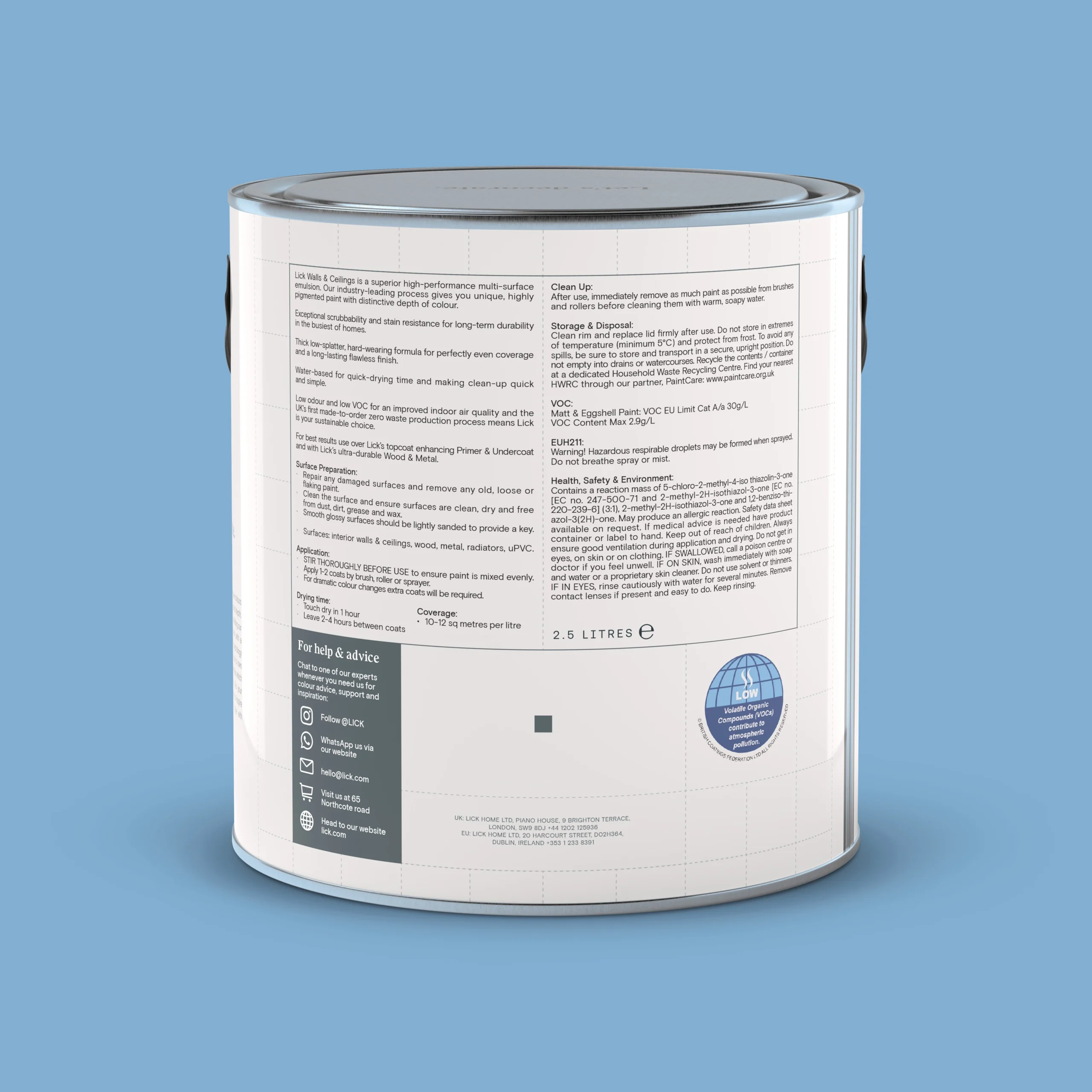 Lick hand-pick the finest pigments for their signature depth of colour and superior coverage. This high-quality formulation is designed to cover up imperfections with a uniform, flawless finish. Create an energising space to ignite your creativity with Blue 10 – a warm mid powder blue with white and yellow undertones. Lick’s mid-sheen eggshell finish is satin-smooth. A hard-wearing, wipeable and high-pigment finish to weather scuffs and scrapes for years to come. Super durable against steam, moisture and water. You can cover 10m² – 13m² per litre, and Lick recommends you apply two coats for maximum long-term durability – just make sure your surfaces are clean and dry before you start decorating.